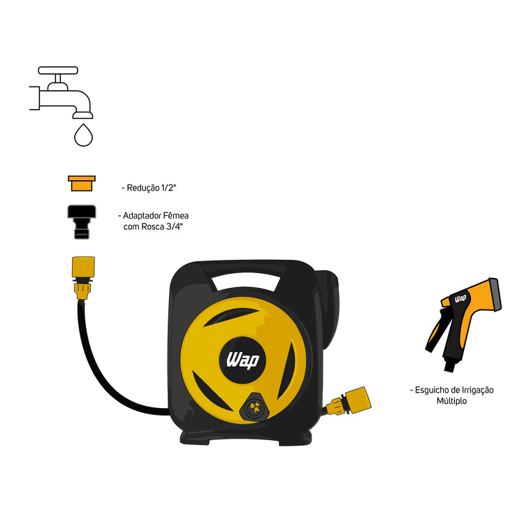 CONTEÚDO DA EMBALAGEM:  Mangueira com Enrolador e Esguicho Múltiplo WAP GMEEM01 + Acessórios + Manual de Instruções.