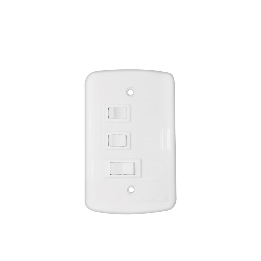 – Acompanha Chave de controle de parede com três velocidades: Chave de controle de velocidade de parede. Liga e desliga a reversão e a iluminação